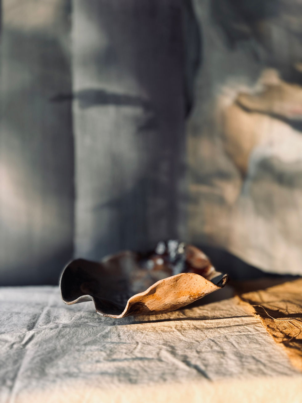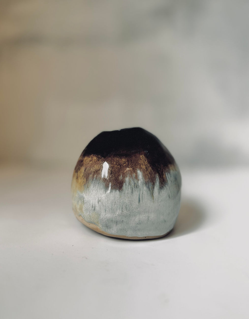 Ten unikalny wazon ceramiczny przyciąga uwagę organiczną formą oraz artystycznym, surowym wykończeniem. Wazon zdobiony jest bogatą paletą naturalnych barw – od ciepłych brązów i ochry po chłodne, ziemiste odcienie z akcentami bieli, które nadają mu wrażenie malarskiej głębi. Każdy egzemplarz jest niepowtarzalny, wyróżniając się subtelnymi nieregularnościami w kształcie i wykończeniu, co podkreśla jego autentyczne, rzemieślnicze wykonanie.